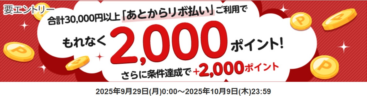 30,000円以上「あとからリボ払い」をご利用でもれなく2,000ポイント!さらに条件達成で2,000ポイント