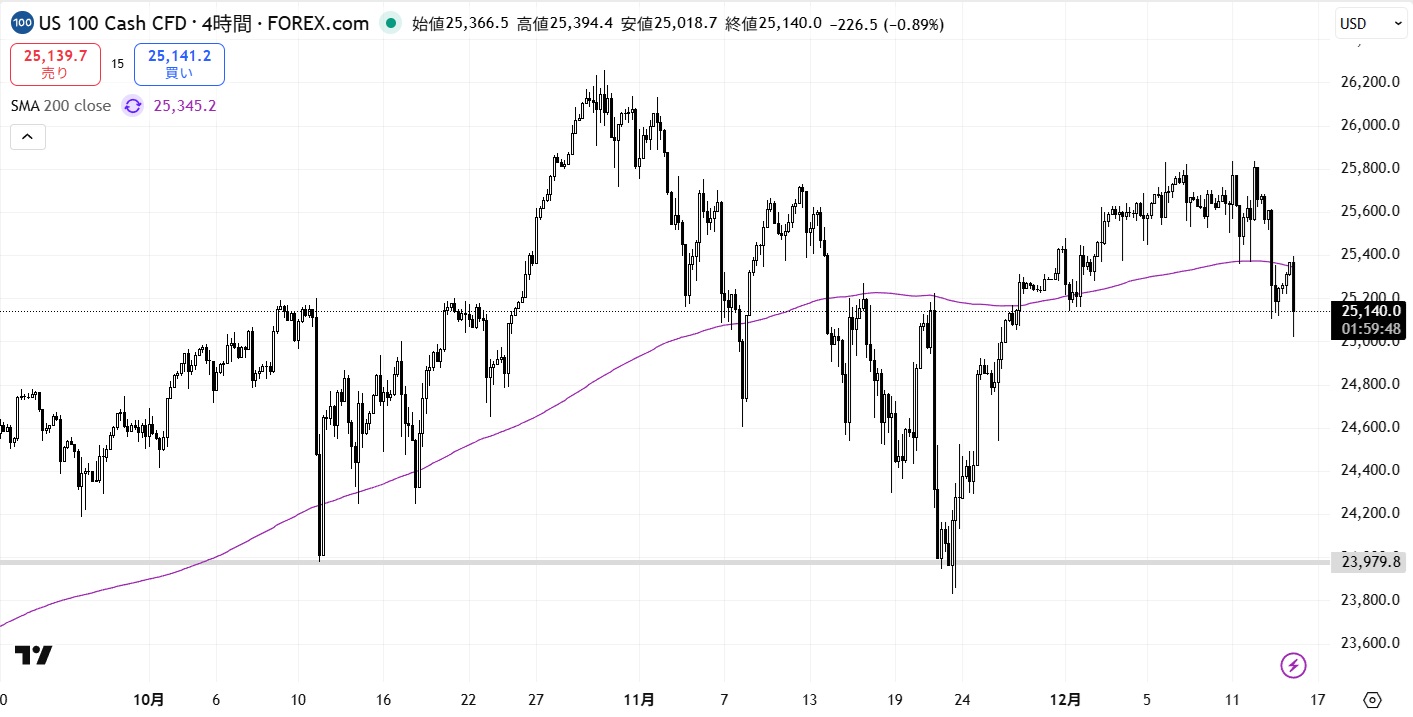 NASDAQ100が200SMAに当たって反落→直近の安値を割ったので下目線。