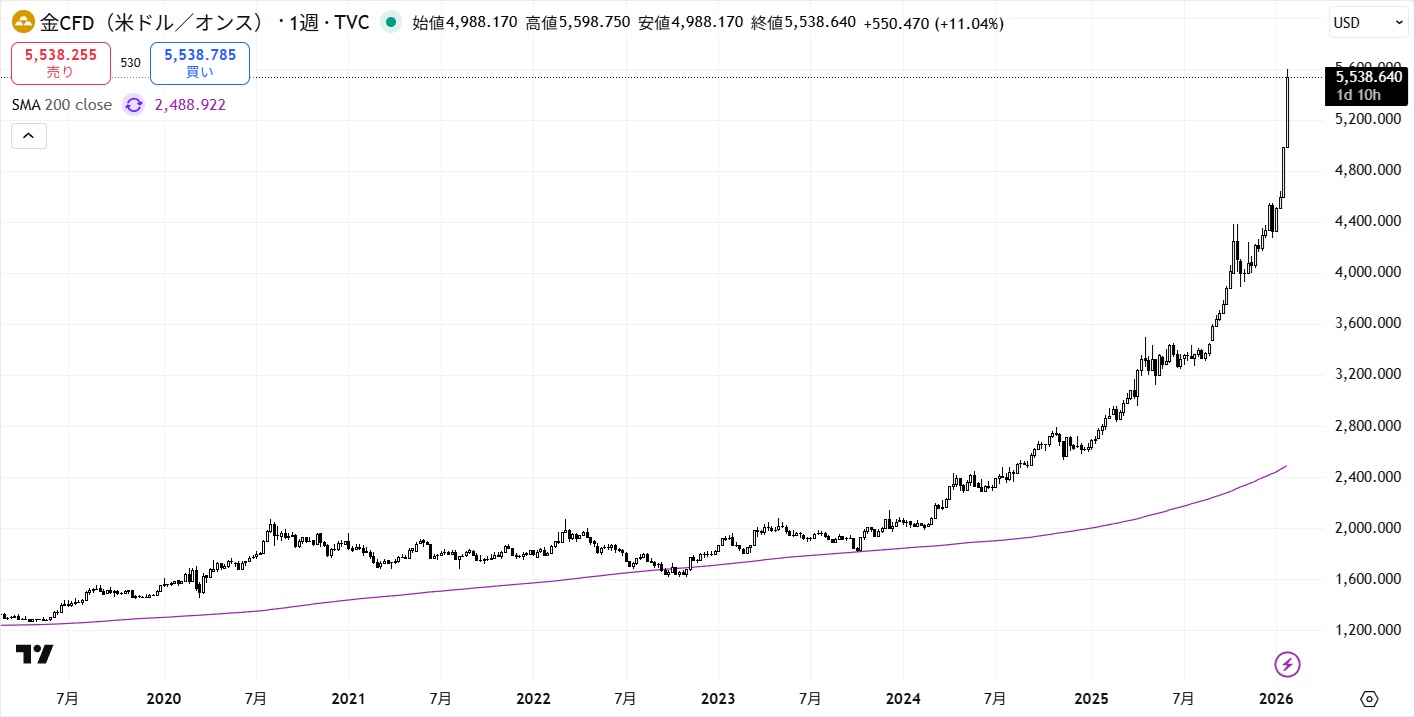 株・投資信託(2026/01/28) ポイ活+株・投信 2026/01/282026/01/29 これ↓ゴールドの週足。 きゃぁーーー怖いわーーー。 てことで一部売却しました。 2026/01/28 ・マネックス証券 [売]ゴールド・ファンド(為替ヘッジあり)28,861円×1,732口=5,000円 ・楽天証券 [売]ゴールド・ファンド(為替ヘッジあり)28,861円×1,732口=5,000円