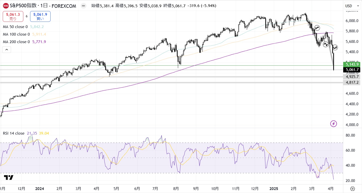 止まりそうな節目は4月19日に付けた安値である4925.7(上の灰太線)や、2022年1月4日に付けた高値である4817.2(下の灰太線)あたりか。