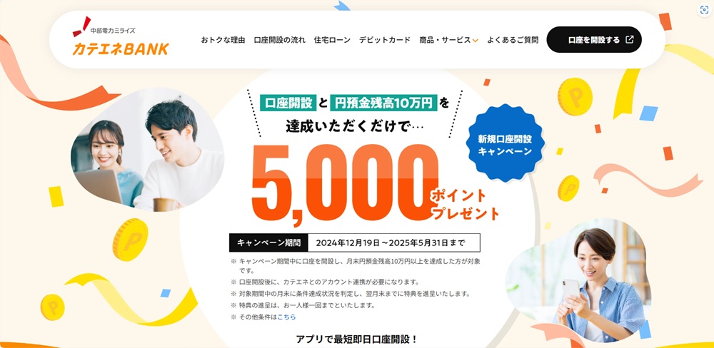 内容:口座開設+円預金残高10万円およびカテエネとのアカウント連携でカテエネポイント5,000ptプレゼント!